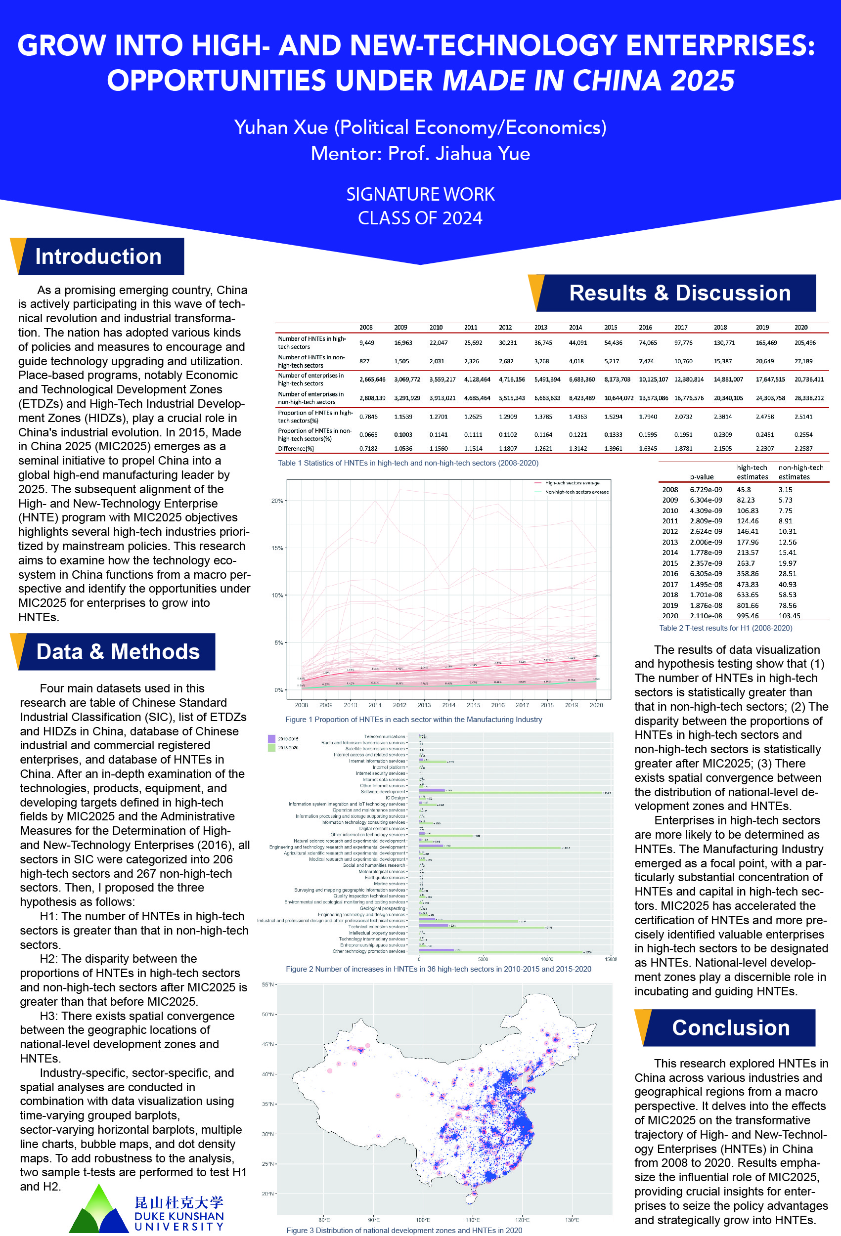 Aimed at improving innovation capacity and enhancing the competitiveness of its high-tech industries, Made in China 2025 (MIC2025), which serves as a selective industrial policy, has attracted great attention after its implementation. This paper delves into the effects of MIC2025 on the transformative trajectory of High- and New-Technology Enterprises (HNTEs) in China from 2008 to 2020. Employing a robust dataset, the research employs a comprehensive analytical framework to discern the evolution of the HNTE population, revealing a substantial surge post-MIC2025. Industry-specific, sector-specific, and spatial analyses are conducted in combination with data visualization using grouped barplots, multiple line charts, and bubble and dot density maps. Employing also rigorous statistical t-tests, I find that the number of HNTEs in high-tech sectors is more than that in non-high-tech sectors and the disparity keeps widening after the release of MIC2025. In the temporal dimension, MIC2025 expedites the advancement of the HNTE program. In the spatial dimension, national-level development zones catalyze the incubation of HNTEs holding the MIC2025-targeted high technology. The research results emphasize the influential role of MIC2025, providing crucial insights for enterprises to seize the policy advantages and strategically grow into HNTEs. |