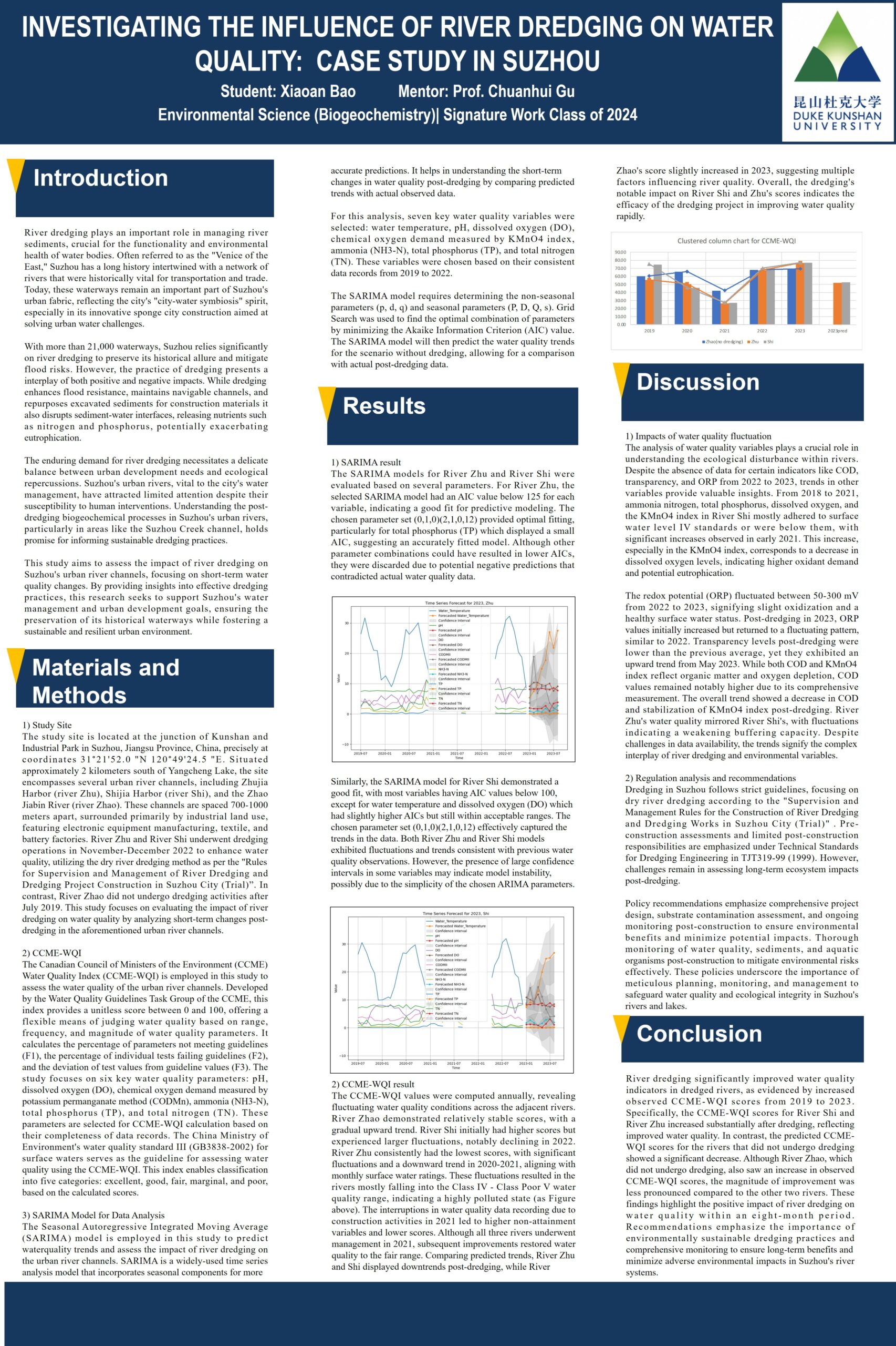 This study explores the impact of river dredging on water quality in Suzhou, China, using a SARIMA model to predict water quality variables in rivers without dredging for comparison. The study spans the water quality data from 2019 to 2023, calculating CCME-WQI scores for each river. Results indicate that rivers Shi and Zhu, two river being dredged, showed significant increases in observed water quality index scores, while the scores for predicted water quality data for these two rivers without dredging decreased substantially. The magnitude of improvement in water quality for nearby undredged Zhao was less than one-fifth of the improvements observed in Shi and Zhu. These findings suggest that river dredging indeed leads to improved water quality within at least an eight-month timeframe. The study emphasizes the importance of employing proper dredging practices and thorough monitoring protocols to mitigate potential environmental impacts.