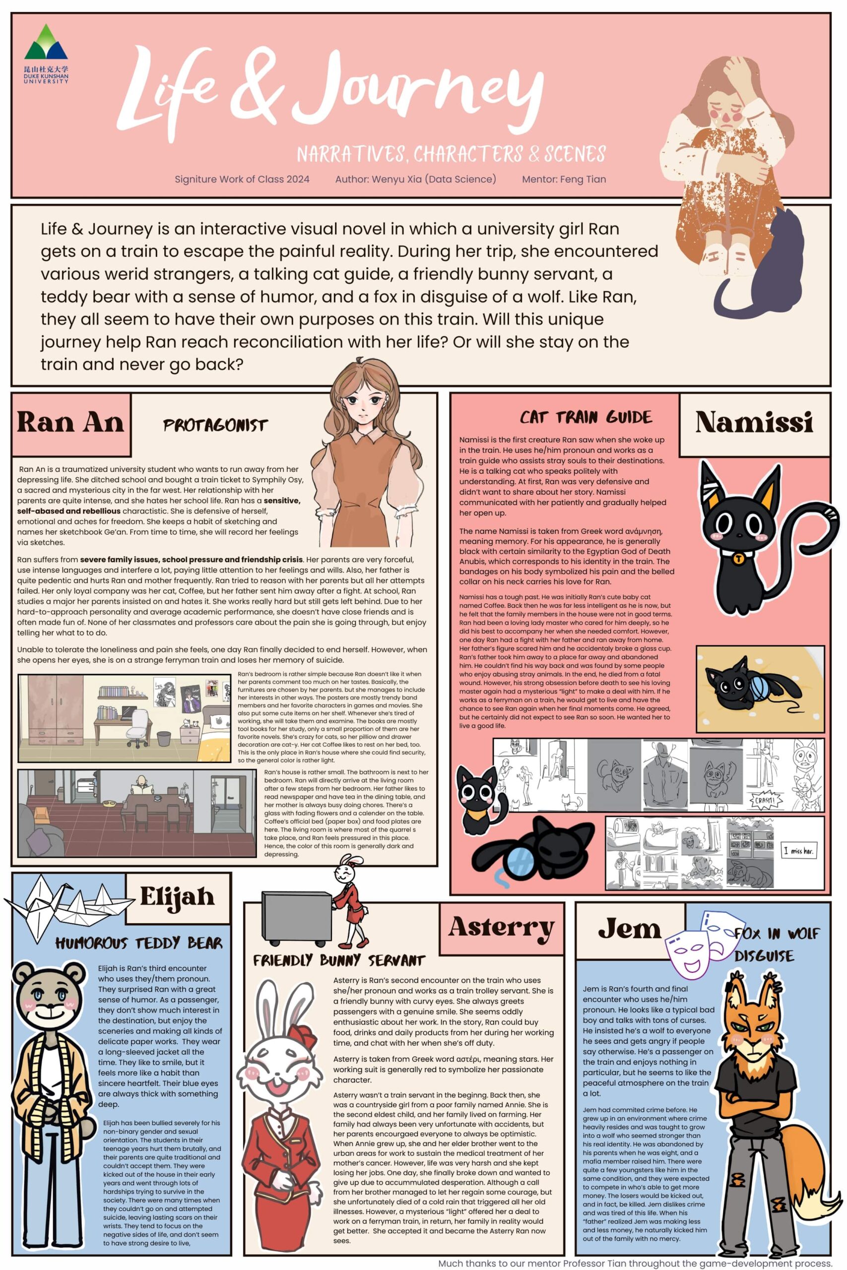 In today’s world, an increasing number of young people are contending with various pressures in their lives. In China, numerous youths are grappling with stress related to their studies, families, employment prospects, peer comparisons, and more, resulting in a significant toll on their mental well-being. Research indicates that many schools and families in China overlook the importance of providing adequate mental health care for young individuals, leading most to cope with their stress independently. Additionally, approximately one fourth of Chinese students have encountered at least one traumatic event during their upbringing. As a game design team, we recognize the importance of addressing the mental health challenges faced by today’s youth and highlighting the significance of self-worth and introspection. To this end, we have created an interactive visual novel about a unique train journey experienced by a traumatized university student. Struggling with family issues, academic pressure, and friendship crises, she seeks an escape from reality by skipping school and boarding this train. Along the journey, she encounters a diverse array of eccentric passengers and staff, engaging in conversations about their respective challenges. Players are given the freedom to navigate how the protagonist responds to life’s adversities, ultimately deciding whether to summon the courage to confront reality or flee.