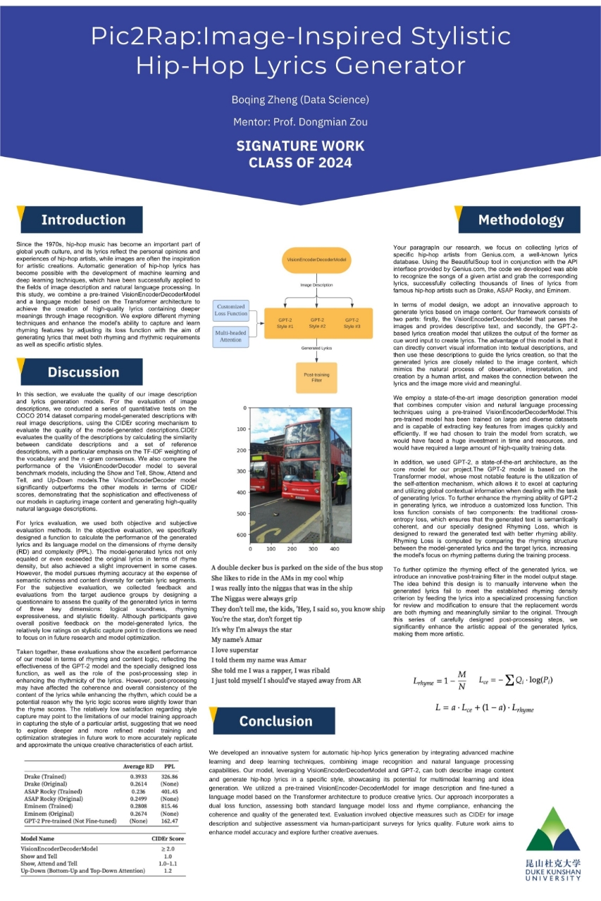 I developed a novel automatic hip-hop lyrics generation model by integrating image recognition techniques with linguistic generation models. The model, based on VisionEncoderDecoderModel and GPT-2, converts image content into hip-hop lyrics in the style of the featured artist. Through pre-training the image recognition model and fine-tuning the language model with artist-specific lyrics datasets, the model learns language patterns and rhyme structures. Optimization techniques such as specific processing functions and an improved loss function ensure rhyme density, coherence, and stylistic consistency in the generated lyrics. Objective and subjective evaluations validate the model’s performance, advancing automated hip-hop lyrics generation and exploring innovative intersections of music and visual arts. |