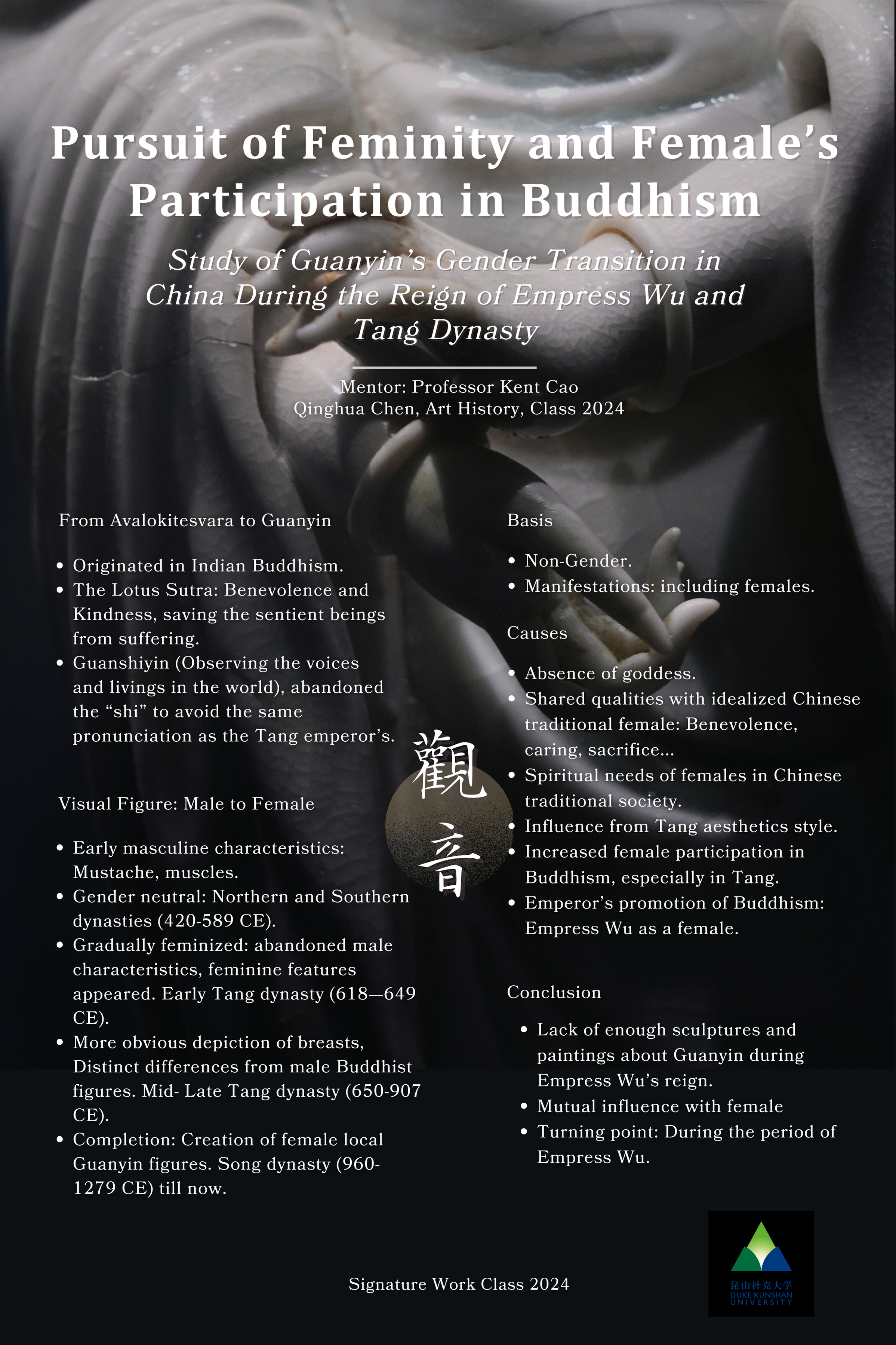 At the beginning of my SW, I chose a research topic with deep cultural connotations: exploring the image of Guanyin in Buddhism and the historical process of its gender transformation. In this process, I was guided by my mentor. Not only did I deepen my understanding of the topic, but I also gradually mapped out a timeline, eventually focusing my research on the historical period of the Tang Dynasty.