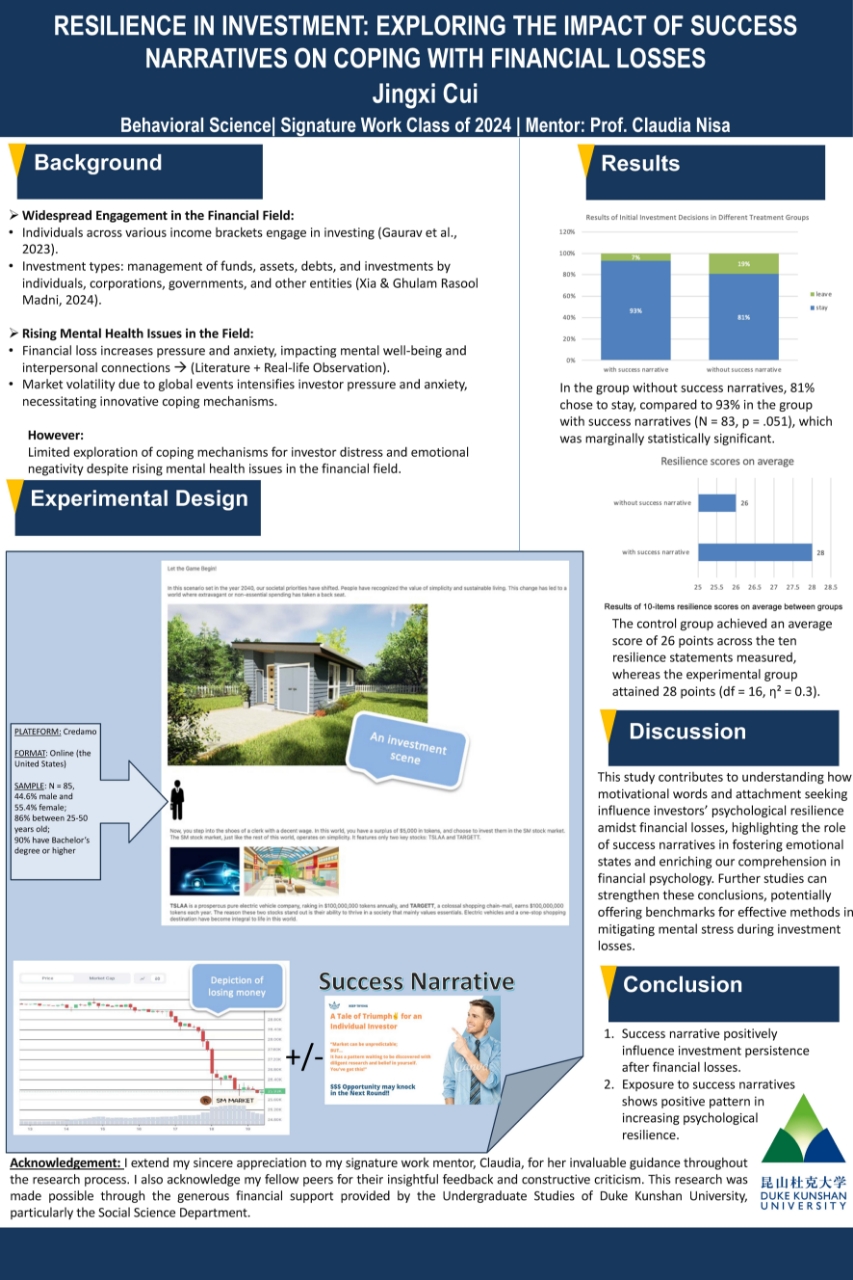 | This project delves into the repercussions of investment losses on mental health in today’s volatile financial landscape. It explores the influence of success narratives-stories of individuals overcoming financial setbacks-on decision-making and psychological resilience. Conducted through an online investment game, 85 participants from the US were randomly assigned to either an Experimental or Control Group. The Experimental Group was exposed to success narratives, while the Control Group was not. The primary outcome measure was participants’ decision to persist in the game after experiencing initial investment losses, serving as an indicator of investment activity persistence. Secondary measures included pre- and post-experiment emotional responses, resilience scores, and perceptions of investment risk. The study found that exposure to success narratives showed a tendency towards increased investment continuation after experiencing losses. However, the current dataset’s limited size prevents definitive conclusions regarding correlations and causality. Additionally, ANOVA analysis revealed a significant impact of success narratives on measured resilience scores, suggesting their potential in bolstering psychological resilience amid financial adversity. Regression analysis identified annual income and education level as significant predictors of investment persistence, highlighting the complex interplay of socioeconomic factors in investment decisions. |