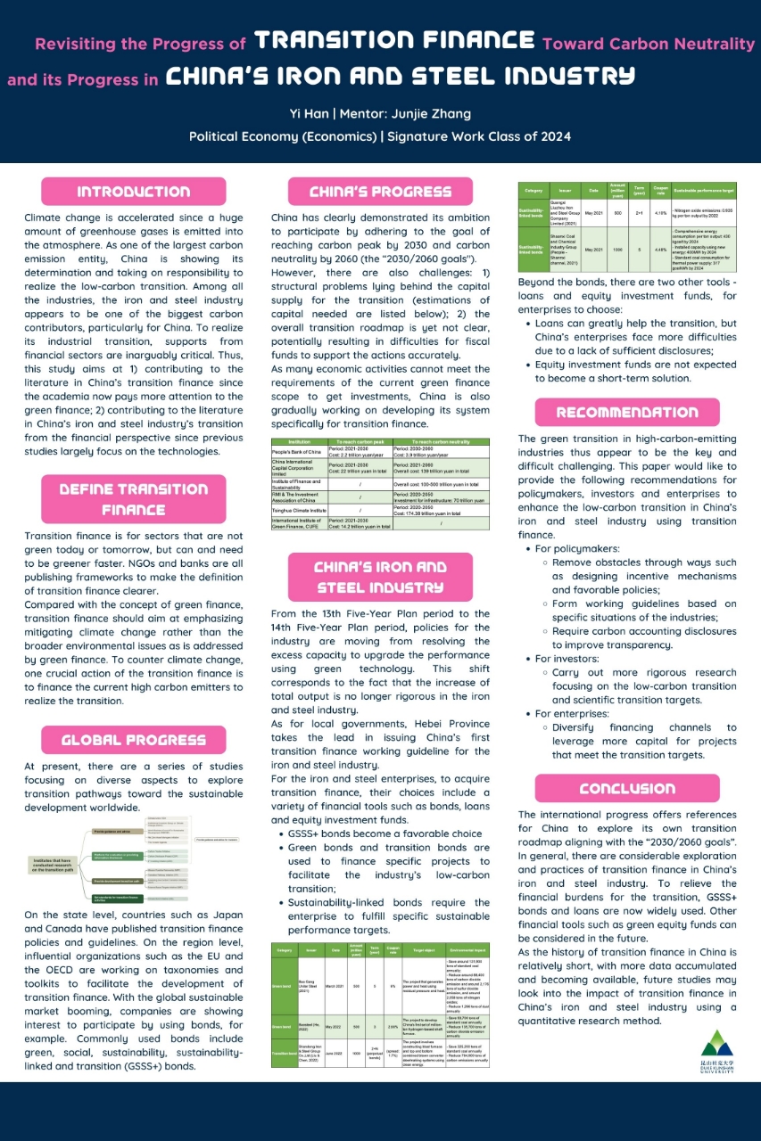 This project aims at exploring the development of transition finance both around the world and in China, while focusing on its progress in China’s iron and steel industry. The project begins with going over the definition for transition finance and distinguish it from green finance. It then explores the global research progress and practices of transition finance, and then turns to the development of transition finance on the national and regional level. Furthermore, influenced by the global applications, the project she light on China’s progress of transition finance and especially discussed the impact of transition finance in China’s iron and steel industry by diving into the commonly used bonds. The project also gives recommendations for policymakers, investors, and enterprises in terms of promoting the impact of transition finance and realize the ambition of carbon neutrality. It suggests that different parties should be coordinated to make full use of the transition finance to achieve the carbon neutrality goals.