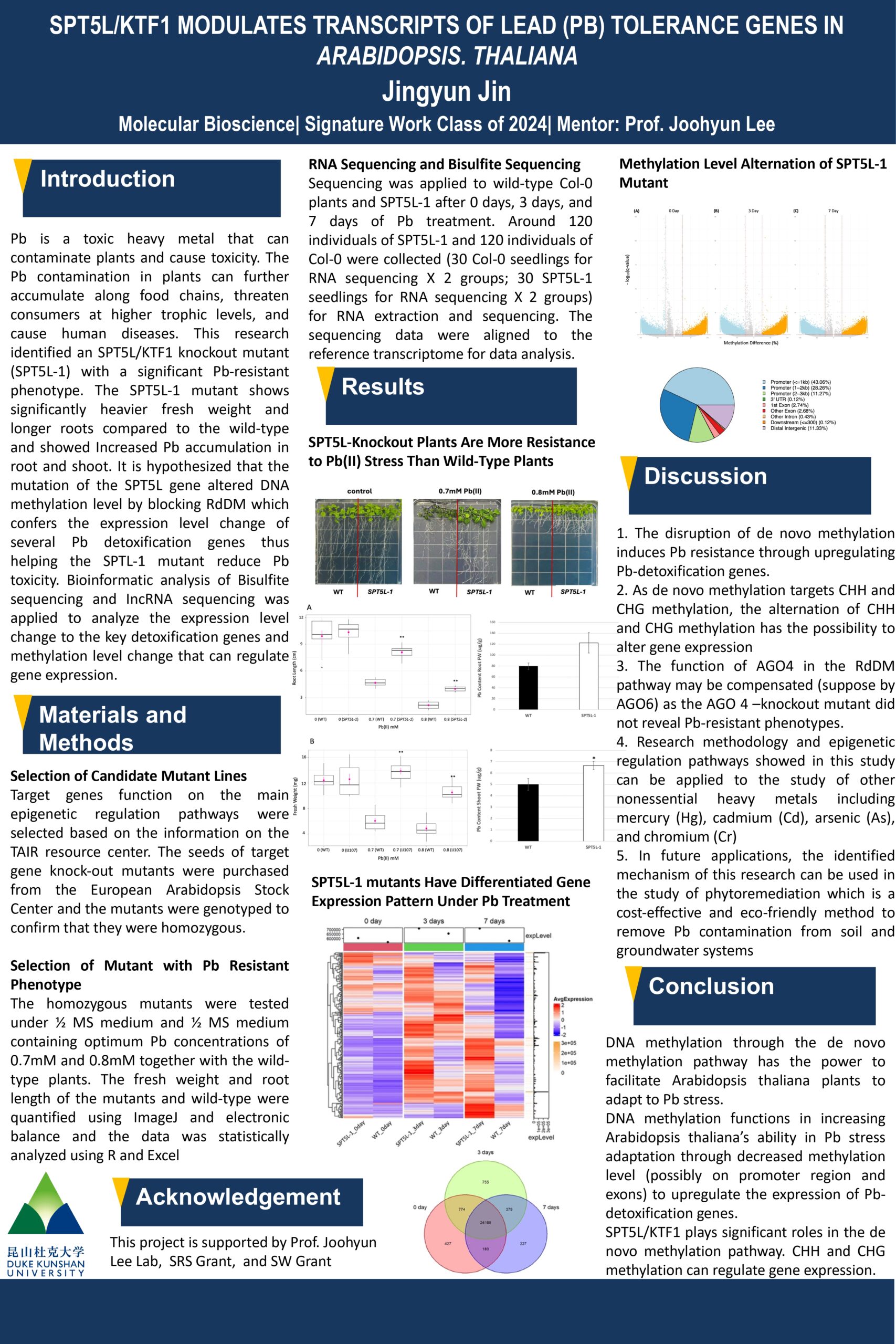 This signature work project aims to explore the DNA methylation level alternation with corresponding gene expression level regulations after treating the model organism Arabidopsis. thaliana with lead (Pb) stress. By testing target mutants under Pb(NO3)2 stress, an SPT5L/KTF1 knockout mutant with significant Pb resistance phenotype was identified. Quantitative comparison and analysis of the phenotypic change show that SPT5L/KTF1 knockout mutant has two times heavier fresh weight and two times longer roots compared to the wild type. ICP-MS testing of the Pb content of roots and shoot samples indicates that SPT5L-mutant plants have a stronger capacity for Pb accumulation compared to wild-type plants. Through bioinformatic analysis of RNA sequencing and Bisulfite sequencing of the mutant under three time points of Pb treatment, a list of Pb-detoxification genes with an above two-fold increase of post-transcriptional level with corresponding decreased methylation level was generated. These results lead to the conclusion that SPT5L/KTF1 knockout decreased DNA methylation level on Pb-detoxification genes which increased their expression results in Pb resistant phenotype of SPT5L/KTF1 knockout mutant.