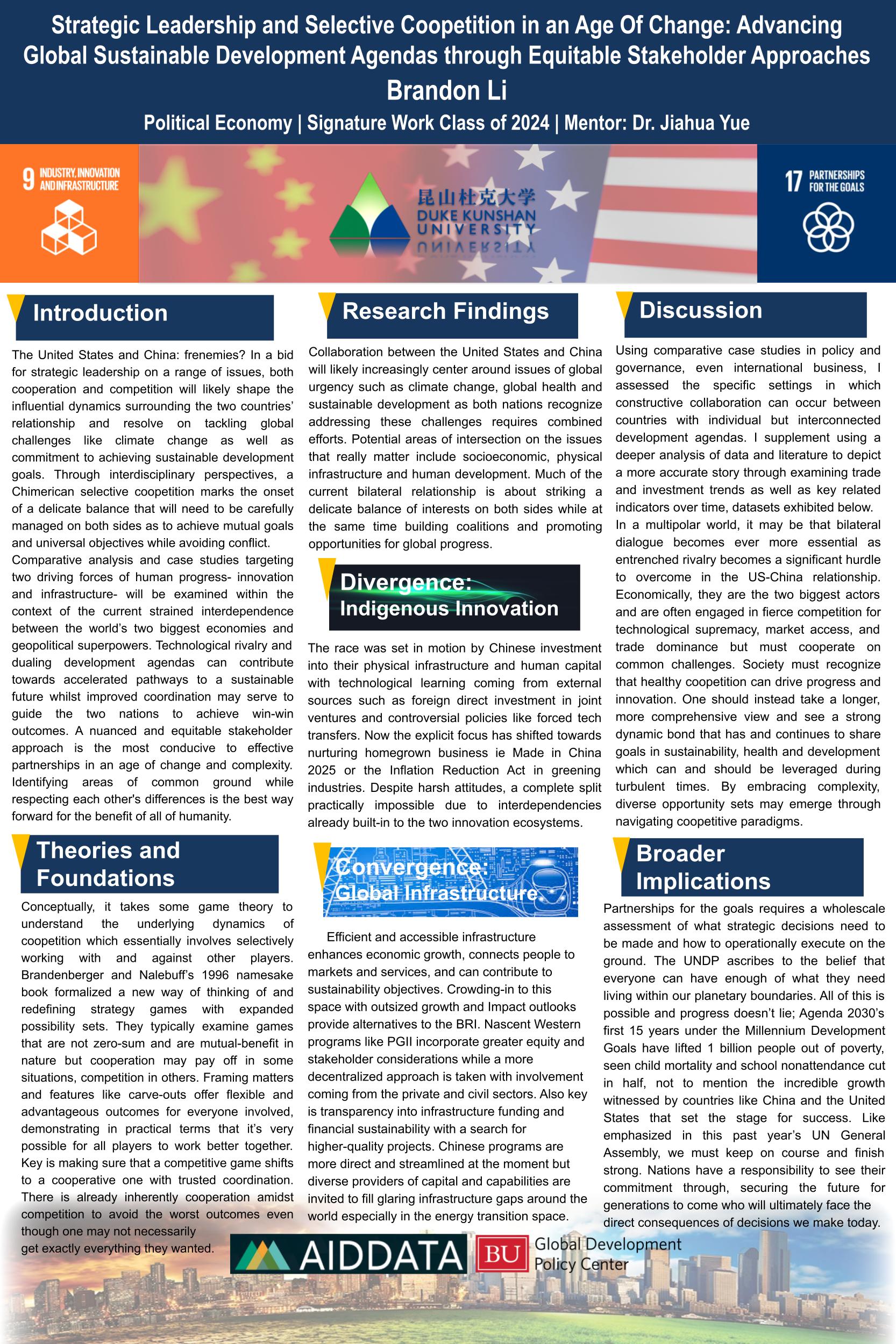 There is no other relationship that is more defining of the last half century than that of the United States and China but its future is decidedly indefinite. In a bid for strategic leadership on a range of issues, selective coopetition will likely shape the influential dynamics surrounding their resolve on tackling global challenges like climate change and commitment to achieving sustainable development goals. Through interdisciplinary perspectives, a combination of cooperation and competition marks the onset of a delicate balance that will need to be carefully managed on both sides as to achieve mutual goals and universal objectives while avoiding conflict. Comparative analysis and case studies targeting two driving forces of human progress- innovation and infrastructure- will be examined within the context of the current strained interdependence between the world’s two biggest economies and geopolitical superpowers. Technological rivalry and dual development agendas can contribute towards accelerated pathways to a sustainable future whilst improved coordination may serve to guide the two nations to achieve win-win outcomes. A nuanced and equitable stakeholder approach are the most conducive to effective partnerships in an age of change and complexity. Identifying areas of common ground while respecting each others differences is the best way forward for the benefit of all of humanity.