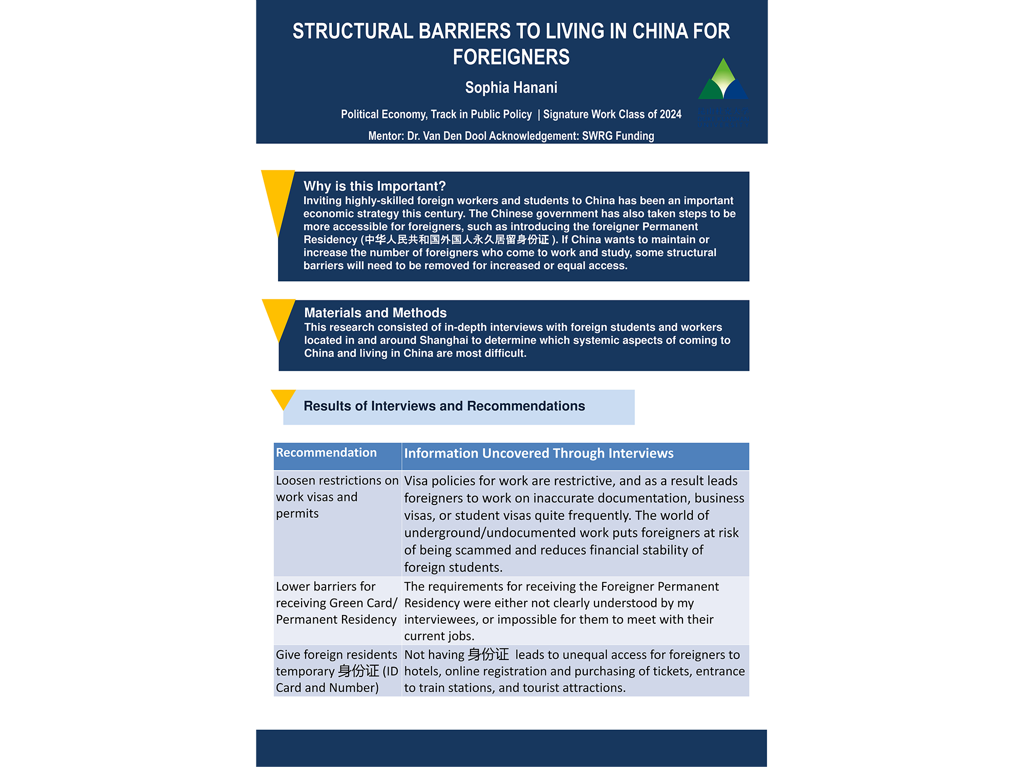 Since 1978, China has been opening up to the outside world. Bringing foreigners into the country to study and work high-skilled jobs has been a prominent part of this reform and continues to be an important part of China’s general economic strategy. Once a country that severely restricted the presence of foreigners, China has relaxed laws over time and allowed greater rights and accessibility for foreign residents. However, foreigners coming to China still face restrictions which have not been fully documented. This research project aims to determine what these restrictions are, and how they act as barriers to China’s goals for inviting foreign students and workers. Through semi-structured interviews with foreigners living in China, I found that foreigners faced important barriers with regards to visas, finances, residence, and travel within the country. Based on the analysis, this paper targets key areas for improvement and puts forth recommendations to allow greater mobility for foreigners to and in China within these areas.