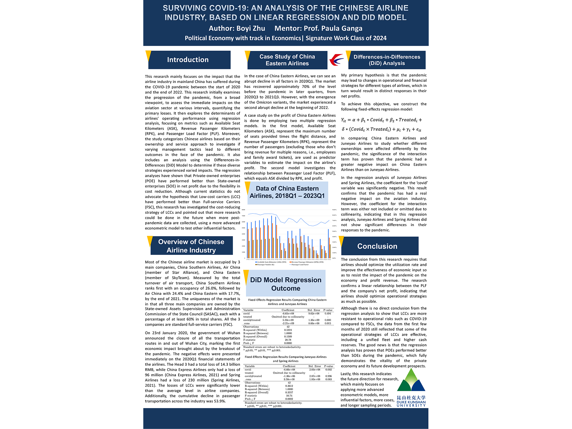 This research mainly focuses on the impact that the airline industry in mainland China has suffered during the COVID-19 pandemic between the start of 2020 and the end of 2022. This research initially examines the progression of the pandemic, from a broad viewpoint, to assess the immediate impacts on the aviation sector at various intervals, quantifying the primary losses. It then explores the determinants of airlines’ operating performance using regression analysis, focusing on metrics such as Available Seat Kilometers (ASK), Revenue Passenger Kilometers (RPK), and Passenger Load Factor (PLF). Moreover, the study categorizes Chinese airlines based on their ownership and service approach to investigate if varying management tactics lead to different outcomes in the face of the pandemic. It also includes an analysis using the Differences-in-Differences (DiD) Model to determine if these diverse strategies experienced varied impacts. The regression analyses have shown that Private-owned enterprises (POE) have performed better than State-owned enterprises (SOE) in net profit due to the flexibility in cost reduction. Although current statistics do not advocate the hypothesis that Low-cost carriers (LCC) have performed better than Full-service Carriers (FSC), this research has investigated the cost-reducing strategy of LCCs and pointed out that more research could be done in the future when more post-pandemic data are collected, using a more advanced econometric model.