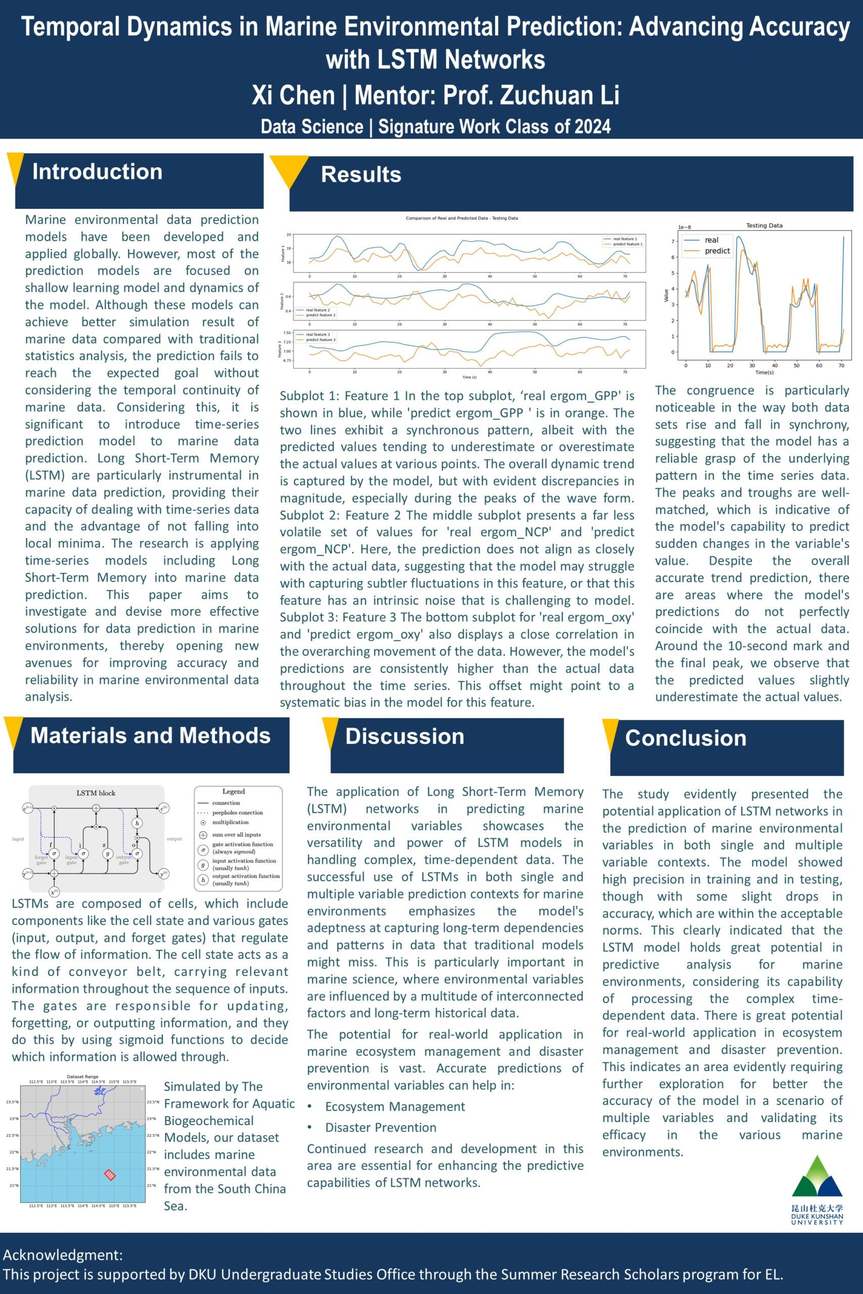 This study investigates the application of Long Short-Term Memory (LSTM) networks for predicting marine environmental variables, focusing on the challenges of analyzing time-dependent marine data. Our research applies LSTM models to predict both single and multiple marine environmental factors with remarkable precision. In the single-variable scenario, the model achieved a Mean Absolute Error (MAE) of 5.43E-09 in training and 8.10E-09 in testing, with a Root Mean Squared Error (RMSE) of 8.99E-09 in training and 1.44E-08 in testing. For the multiple-variable scenario, the model demonstrated an MAE of 2.40E-01 in training and 2.26E-01 in testing, alongside an RMSE of 3.67E-01 in training and 3.02E-01 in testing. These results illustrate the LSTM model’s capability to handle the complexity of marine data accurately, marking a significant advance in marine environmental prediction accuracy and reliability. The findings suggest promising avenues for model precision enhancement and validation across varied marine environments, offering new prospects for marine ecosystem management and disaster prevention strategies. |