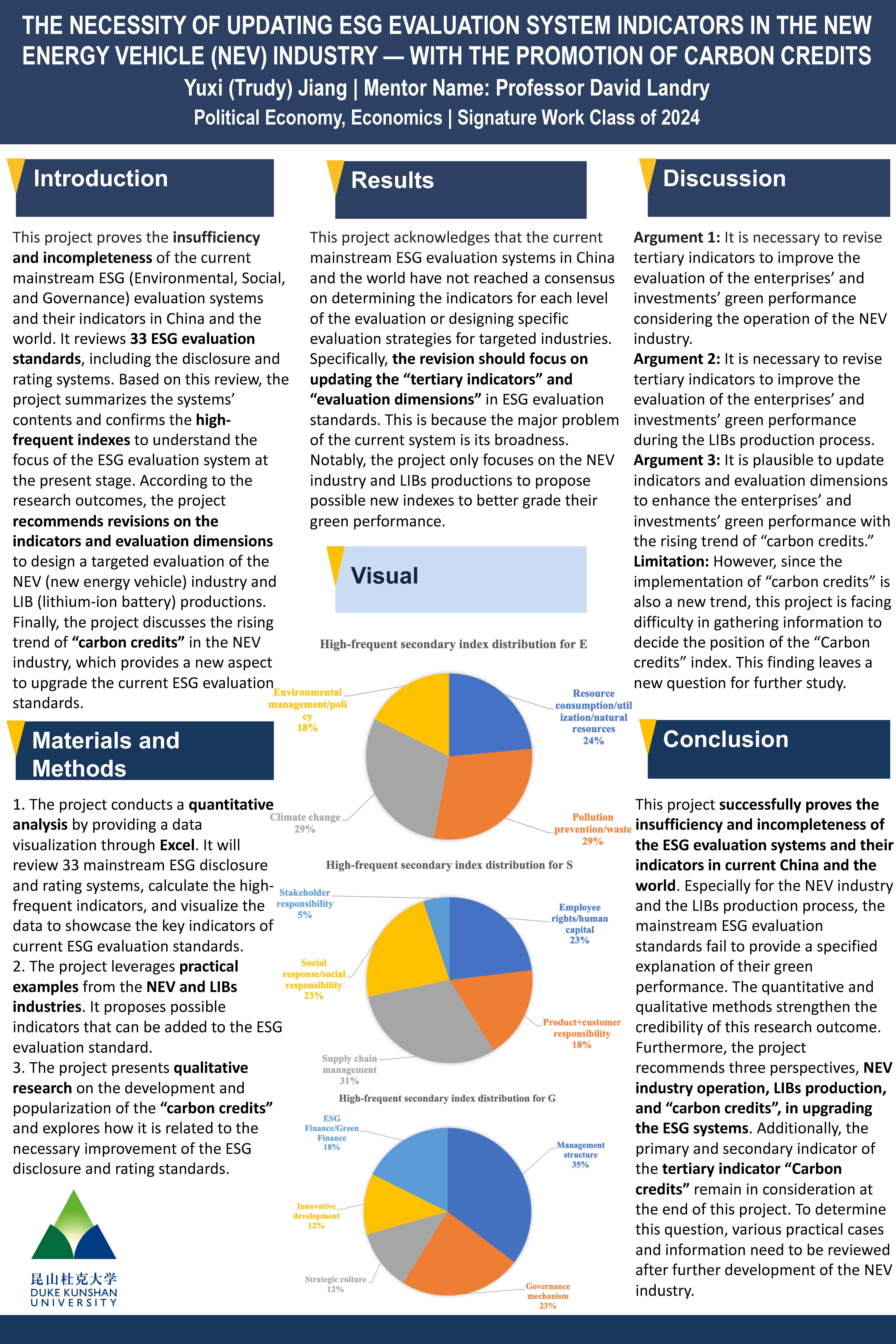 This paper proves the insufficiency and incompleteness of the current mainstream ESG (Environmental, Social, and Governance) evaluation systems and their indicators in China and the world, by reviewing 33 ESG evaluation standards (including the disclosure and rating systems). Based on this review, the paper summarizes the systems’ contents and confirms the high-frequent indexes to understand the focus of the ESG evaluation system at the present stage. According to the research outcomes, the paper recommends further revisions on the indicators and evaluation dimensions to design a targeted evaluation of the NEV (new energy vehicle) industry and LIB (lithium-ion battery) productions. Finally, the paper believes the rising trend of “carbon credits” provides a new aspect to upgrade the current ESG evaluation standards. This paper leverages both the quantitative and qualitative methods to conduct the results.