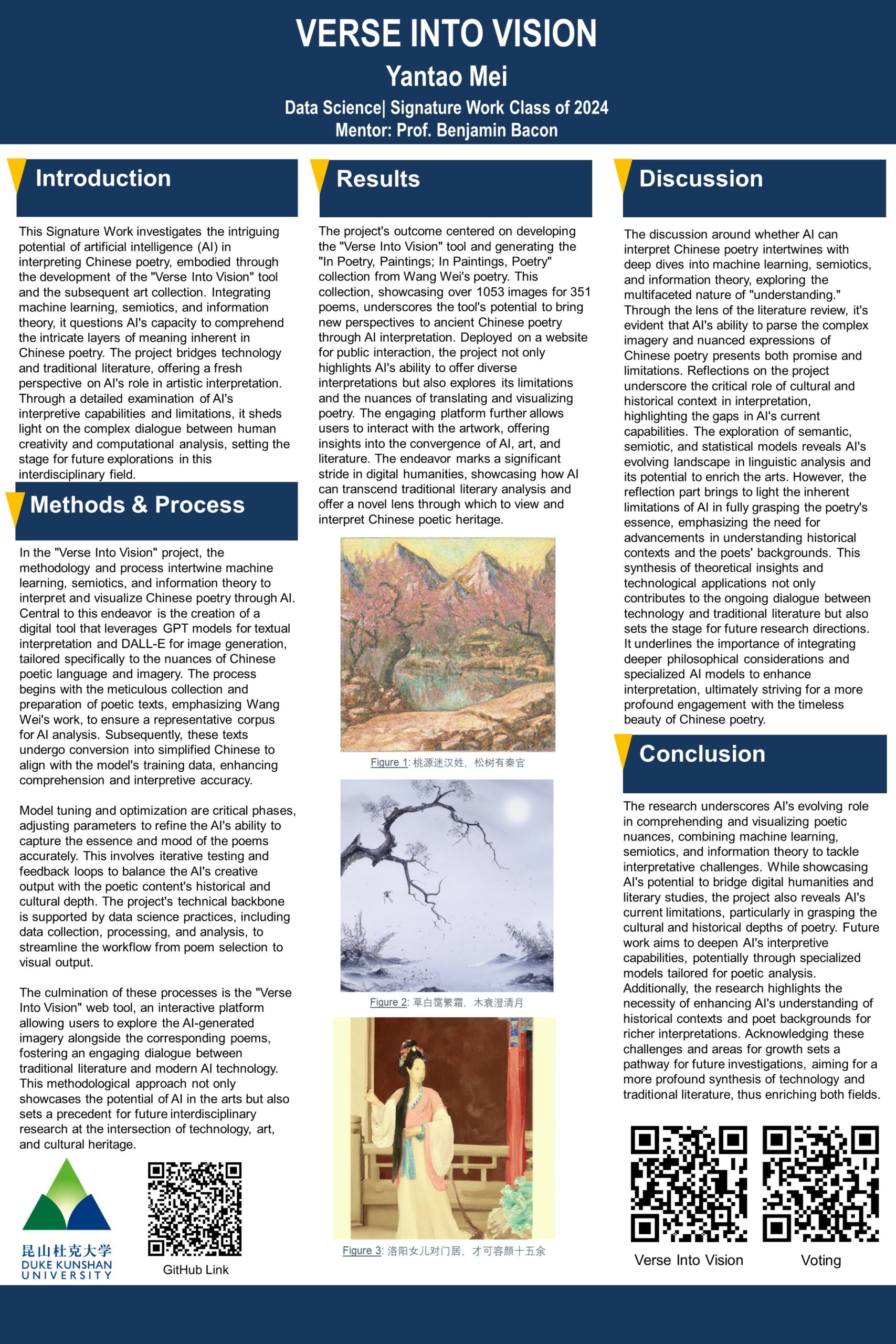 This Signature Work project delves into artificial intelligence’s (AI) ability to interpret Chinese poetry, highlighted through the development of the “Verse Into Vision” tool and the accompanying collection, “In Poetry, Paintings; In Paintings, Poetry.” Integrating concepts from machine learning, semiotics, and information theory, the research scrutinizes AI’s effectiveness in grasping the complex essence of poetry. Utilizing statistical modeling, semiotic analysis, and Systemic Functional Linguistics, it addresses the challenges of poetic interpretation and translation. The project’s outcomes reveal both the potential and current limitations of AI in fully appreciating the nuances of Chinese poetry, advocating for advancements in AI’s comprehension of historical context and cultural nuances to achieve more profound interpretations. The methodological journey also encompasses data science practices such as data collection, processing, and model tuning, alongside website development. Future directions include deeper philosophical explorations and the development of specialized AI models for translating and interpreting poetry, underlining the project’s contribution to the dialogue between technology and traditional literature. |