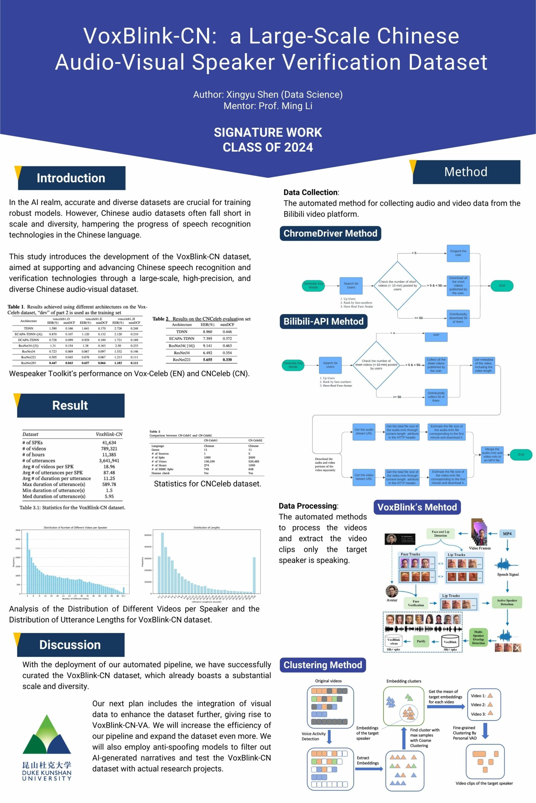 In this paper, we will introduce VoxBlink-CN, a large-scale Chinese audio-visual speaker verification dataset, comprising over 41,739 speakers. The dataset addresses critical limitations inherent in existing Chinese audio datasets, such as the restricted number of speakers, labeling inaccuracies, and challenges in achieving effective generalization across diverse audio-visual contexts. By leveraging an automated pipeline for efficient data extraction from Bilibili-a famous Chinese video-sharing platform-we significantly expanded the diversity and volume of Chinese audio data available for research. Our methodology involves the development of a novel video processing pipeline capable of extracting speaker-specific clips from extensive video materials, ensuring high precision and diversity in dataset composition. The dataset has a great potential to dramatically enhance model performance in Chinese speaker verification tasks, underscoring its considerable scale and scope compared to existing datasets. The comprehensive design of the pipeline also guarantees both efficiency and stability. VoxBlink-CN’s development reflects a significant advancement in the resources available for Chinese language audio-visual research, offering a robust foundation for future explorations in speech recognition, speaker verification, and multimodal machine learning applications.