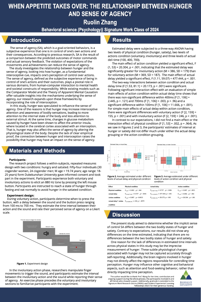 | This research project investigates the impact of physiological states (hunger vs. satiety) and action conditions (voluntary vs. involuntary) on time perception. Conducted at Duke Kunshan University with a diverse participant pool, the study aimed to understand how internal states like hunger and external factors like the nature of actions influence individuals’ abilities to estimate time delays. Despite rigorous manipulation checks and detailed analyses using ANOVA and regression models, findings revealed that while action conditions and the duration of delay significantly affected time estimation, physiological states such as hunger and satiety did not exhibit a noticeable impact. These results suggest that cognitive tasks like time perception may be more strongly influenced by external cues and the characteristics of tasks rather than internal physiological states. This study contributes to the broader understanding of time perception mechanisms and opens avenues for future research to explore other factors that may influence cognitive processes. |